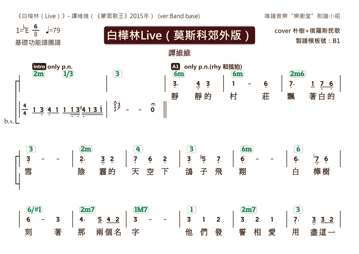 “乐厨堂”乐谱发布小组: 出版级乐谱扒谱制谱——以职业乐手圈通行标准记谱,遵循原版和声、伴奏元素和段落结构。 ❶ 2.0多功能专业团谱:采用台湾卓著公司开创的二代简谱标准制作。二代简谱无疑是迄今为止最科学、最易读的专业范畴多功能记谱方案:❷ 框架谱:采用职业乐手通常记谱方案制作。