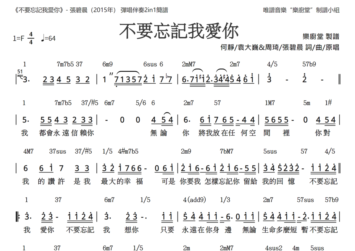 《不要忘记我爱你》是张碧晨演唱的一首歌曲,和弦简谱,这份乐队总谱共有两张高清图谱,图谱由 @唯谱音乐"乐厨堂"发布小组 编配上传。