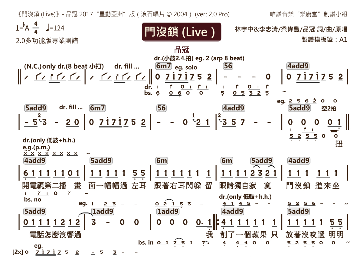 品冠《门没锁(Live)-《声动亚洲》版》乐队总谱 - 2.0版多功能团谱
