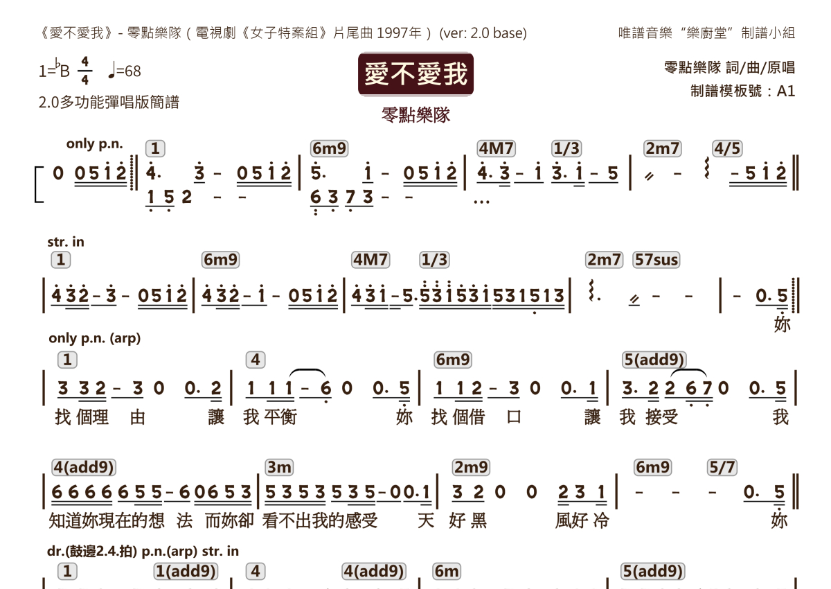 “乐厨堂”乐谱发布小组: 出版级乐谱扒谱制谱——以职业乐手圈通行标准记谱,遵循原版和声、伴奏元素和段落结构。 ❶ 2.0多功能专业团谱:采用台湾卓著公司开创的二代简谱标准制作。二代简谱无疑是迄今为止最科学、最易读的专业范畴多功能记谱方案:❷ 框架谱:采用职业乐手通常记谱方案制作。