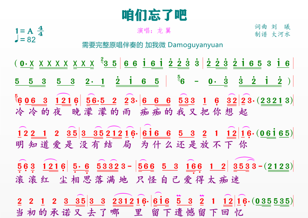 《咱们忘了吧》是龙翼演唱的一首歌曲,拍号为4/4拍,歌曲速度为每分钟82拍,这份简谱共有一张高清图谱,图谱由 @临海雪原 编配上传。