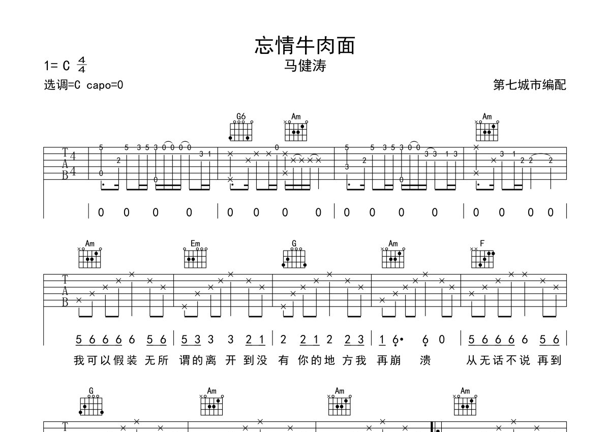 马健涛《忘情牛肉面》吉他谱 - C调弹唱六线谱