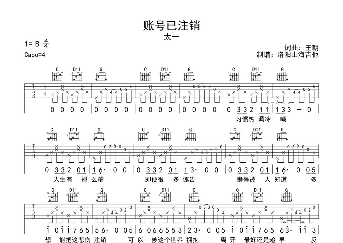 《账号已注销》是太一演唱的一首歌曲,本吉他谱采用的是G调指法编配,这份吉他谱共有两张高清图谱,图谱由 @何奔洋 编配上传,图谱使用六线谱编配,包含吉他和弦指法、简谱以及歌词部分,曲谱配备了相关的音频提供试听,使用这份账号已注销吉他谱,可以让你更加方便地掌握这首歌曲的弹唱技巧,快来尝试吧。