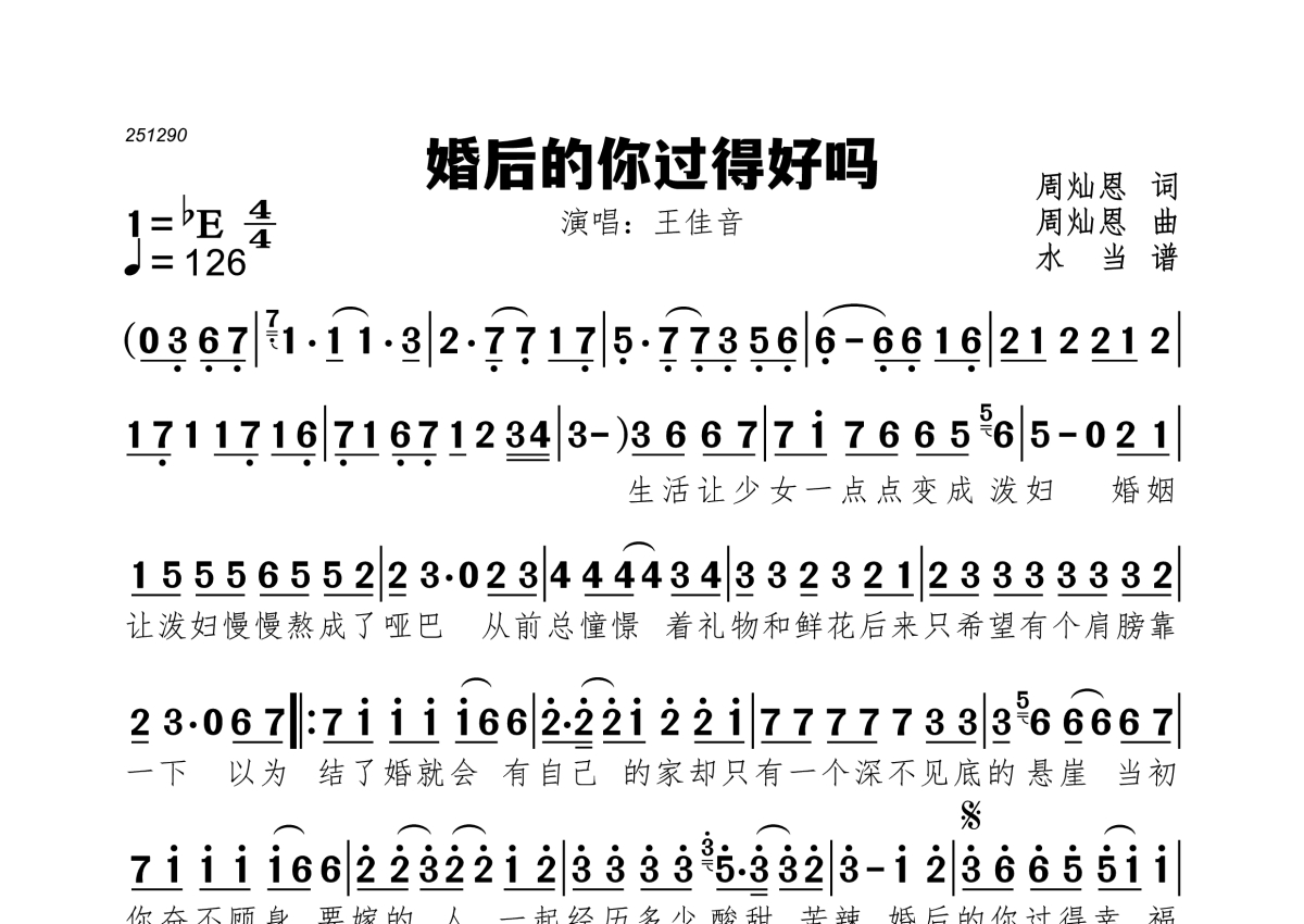 《婚后的你过得好吗》是王佳音演唱的一首歌曲,拍号为4/4拍,歌曲速度为每分钟126拍,这份简谱共有一张高清图谱,图谱由 @水当 编配上传。