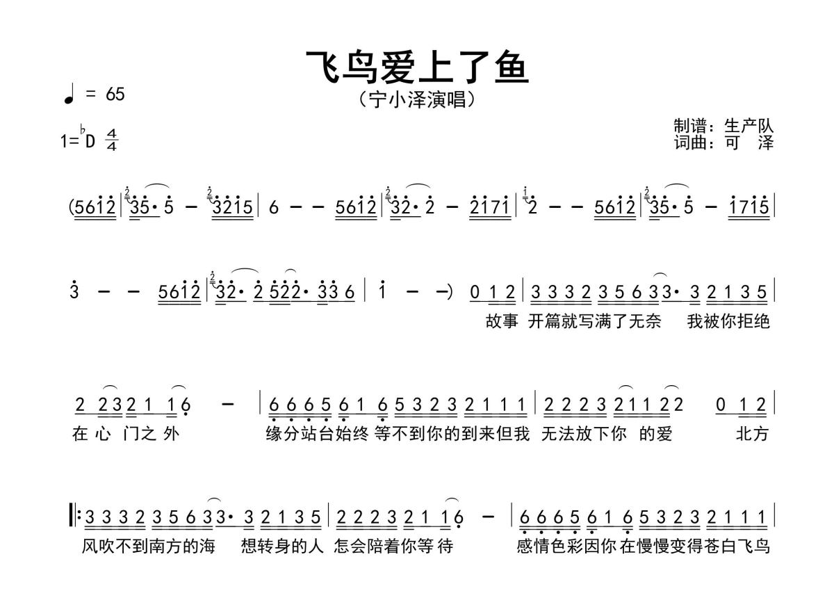 《飞鸟爱上了鱼》是宁小泽演唱的一首歌曲,原版简谱,拍号为4/4拍,歌曲速度为每分钟65拍,这份简谱共有一张高清图谱,图谱由 @生产队 编配上传宁小泽演唱的歌曲《飞鸟爱上了鱼》原版简谱,完整的前奏、间奏、尾奏solo编配,精编完美版,优质推荐!。