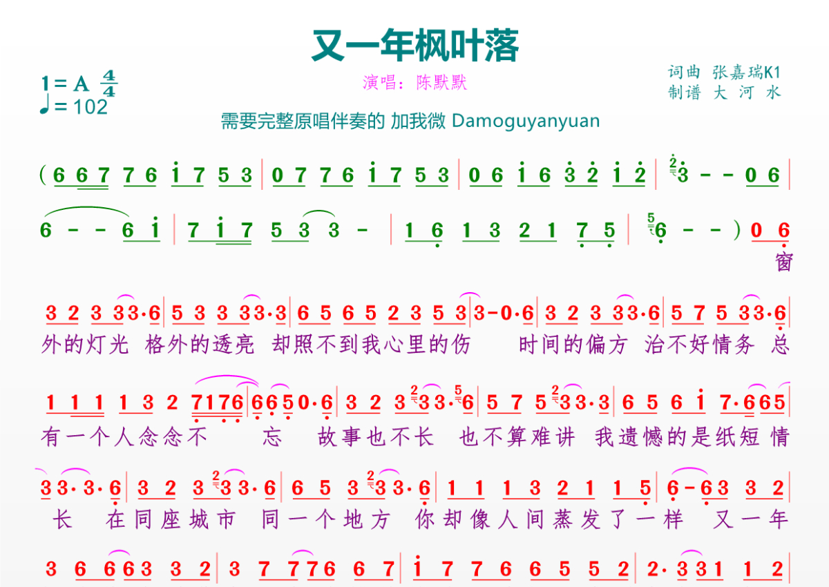 《又一年枫叶落》是陈默默演唱的一首歌曲,拍号为4/4拍,歌曲速度为每分钟102拍,这份简谱共有一张高清图谱,图谱由 @临海雪原 编配上传。