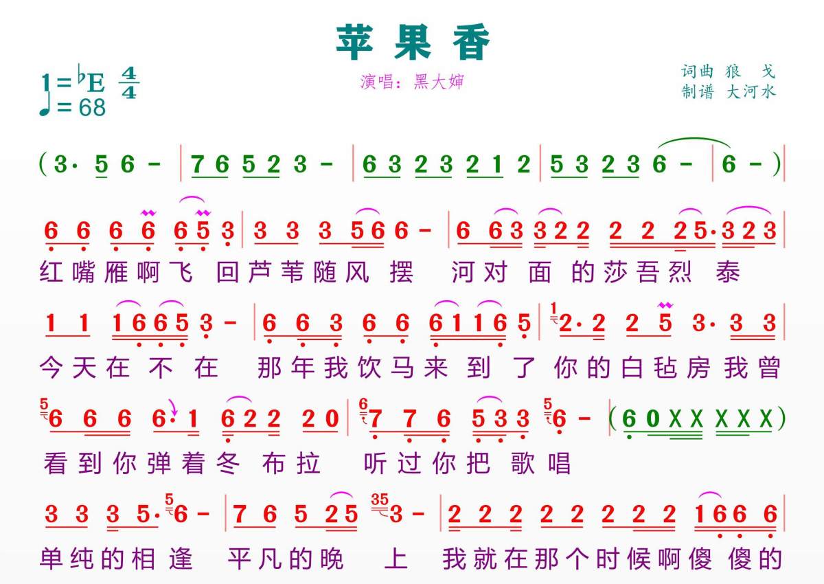 《苹果香》是黑大婶演唱的一首歌曲,拍号为4/4拍,歌曲速度为每分钟68拍,这份简谱共有一张高清图谱,图谱由 @临海雪原 编配上传。