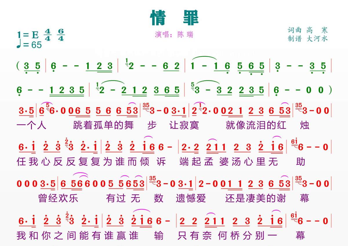 《情罪》是陈瑞演唱的一首歌曲,拍号为4/4拍,歌曲速度为每分钟65拍,这份简谱共有一张高清图谱,图谱由 @临海雪原 编配上传。