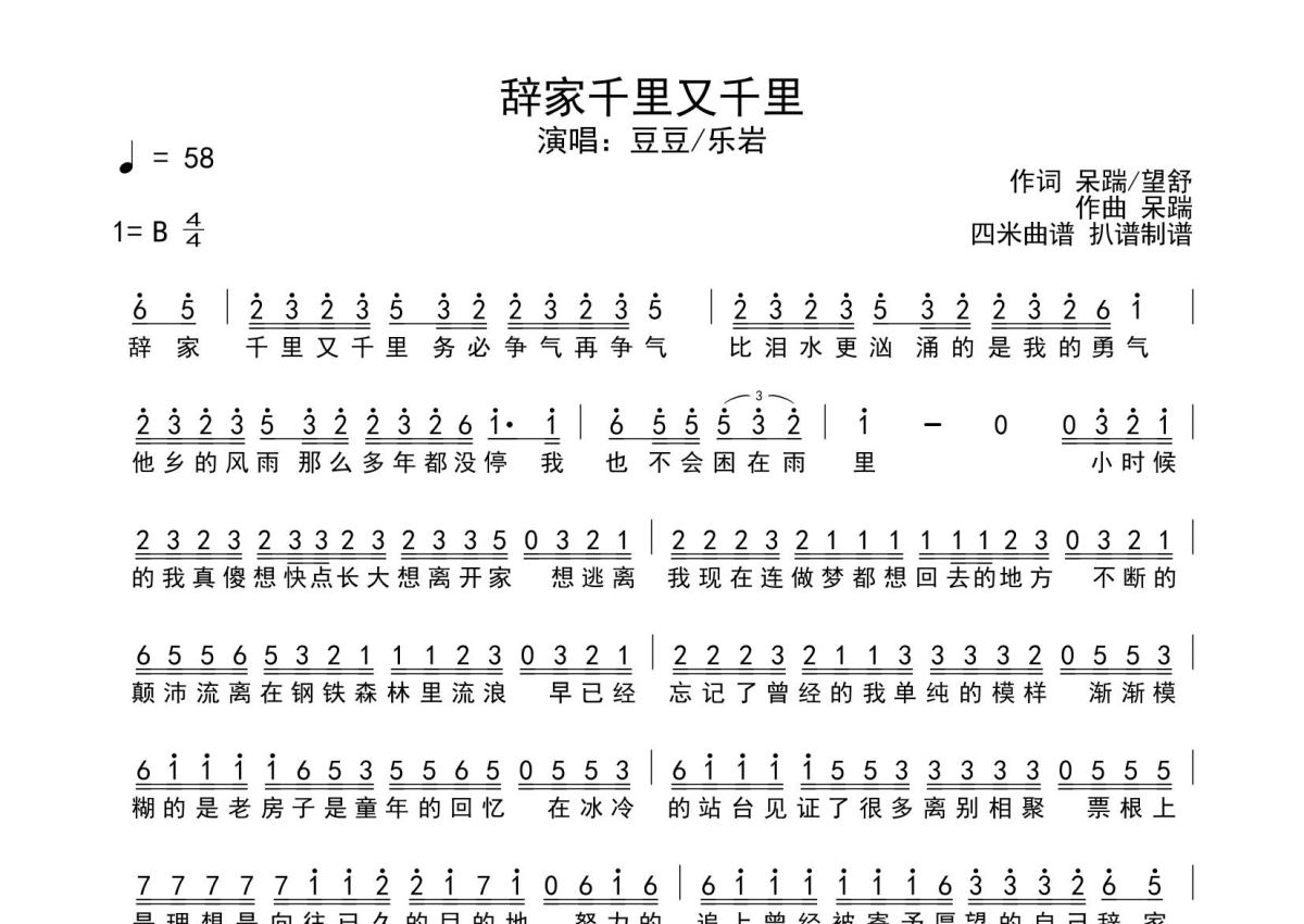 《辞家千里又千里》是豆豆/乐岩演唱的一首歌曲,拍号为4/4拍,这份简谱共有一张高清图谱,图谱由 @SRV7758521 编配上传。