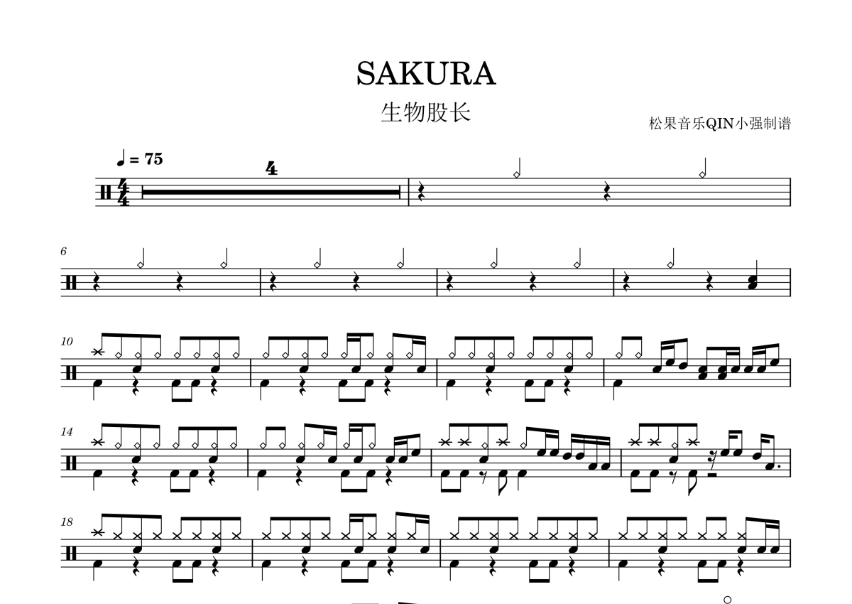 《Sakura》是生物股长演唱的一首歌曲,拍号为4/4拍,这份架子鼓谱共有三张高清图谱,图谱由 @松果音乐QIN小强 编配上传,图谱使用五线谱编配,使用这份Sakura架子鼓谱,你将能够轻松地敲打出这首生物股长的Sakura,快来尝试吧。《Sakura》是收录在同名专辑《Sakura》中的一首日本知名乐队生物股长出道成名歌曲,DENPO115东日本地区CM歌曲。