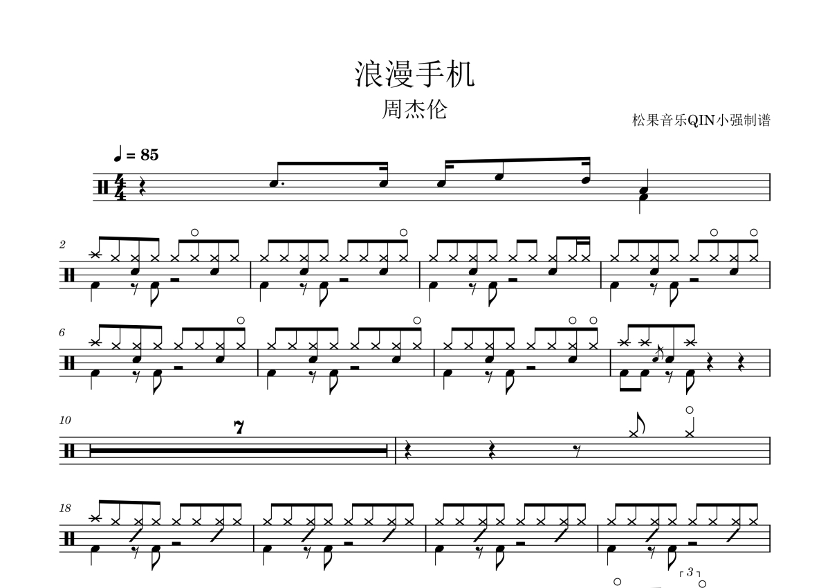 《浪漫手机》是周杰伦演唱的一首歌曲,拍号为4/4拍,这份架子鼓谱共有两张高清图谱,图谱由 @松果音乐QIN小强 编配上传,图谱使用五线谱编配,使用这份浪漫手机架子鼓谱,你将能够轻松地敲打出这首周杰伦的浪漫手机,快来尝试吧。《浪漫手机》是周杰伦演唱的普通话歌曲,由方文山作词,周杰伦作曲并担任制作人,洪敬尧负责编曲。该歌曲收录于周杰伦2005年11月1日发行的专辑《11月的萧邦》中,外文名为“Romantic Cellphone”。