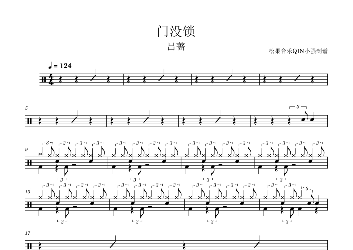 《门没锁》是吕蔷演唱的一首歌曲,拍号为4/4拍,这份架子鼓谱共有三张高清图谱,图谱由 @松果音乐QIN小强 编配上传,图谱使用五线谱编配,使用这份门没锁架子鼓谱,你将能够轻松地敲打出这首吕蔷的门没锁,快来尝试吧。吕蔷(Amuyi)演唱的《门没锁》是她在《梦想的声音》第二季中的翻唱版本,展现了其独特的音乐才华。