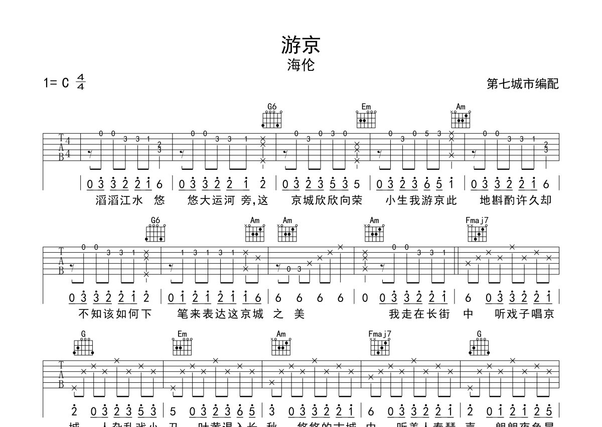 海伦《游京》吉他谱 - C调弹唱六线谱