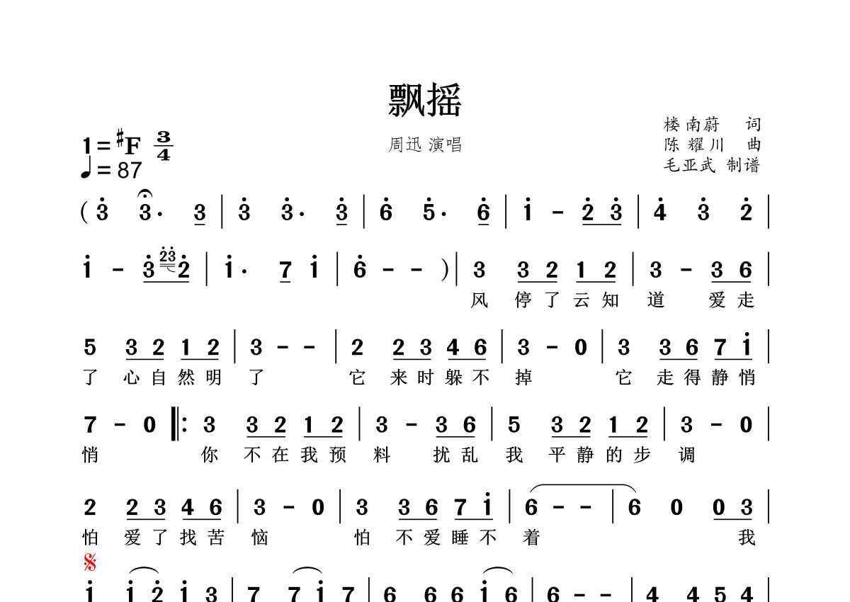 《飘摇》是周迅演唱的一首歌曲,拍号为3/4拍,这份简谱共有一张高清图谱,图谱由 @秋天的童话 编配上传。