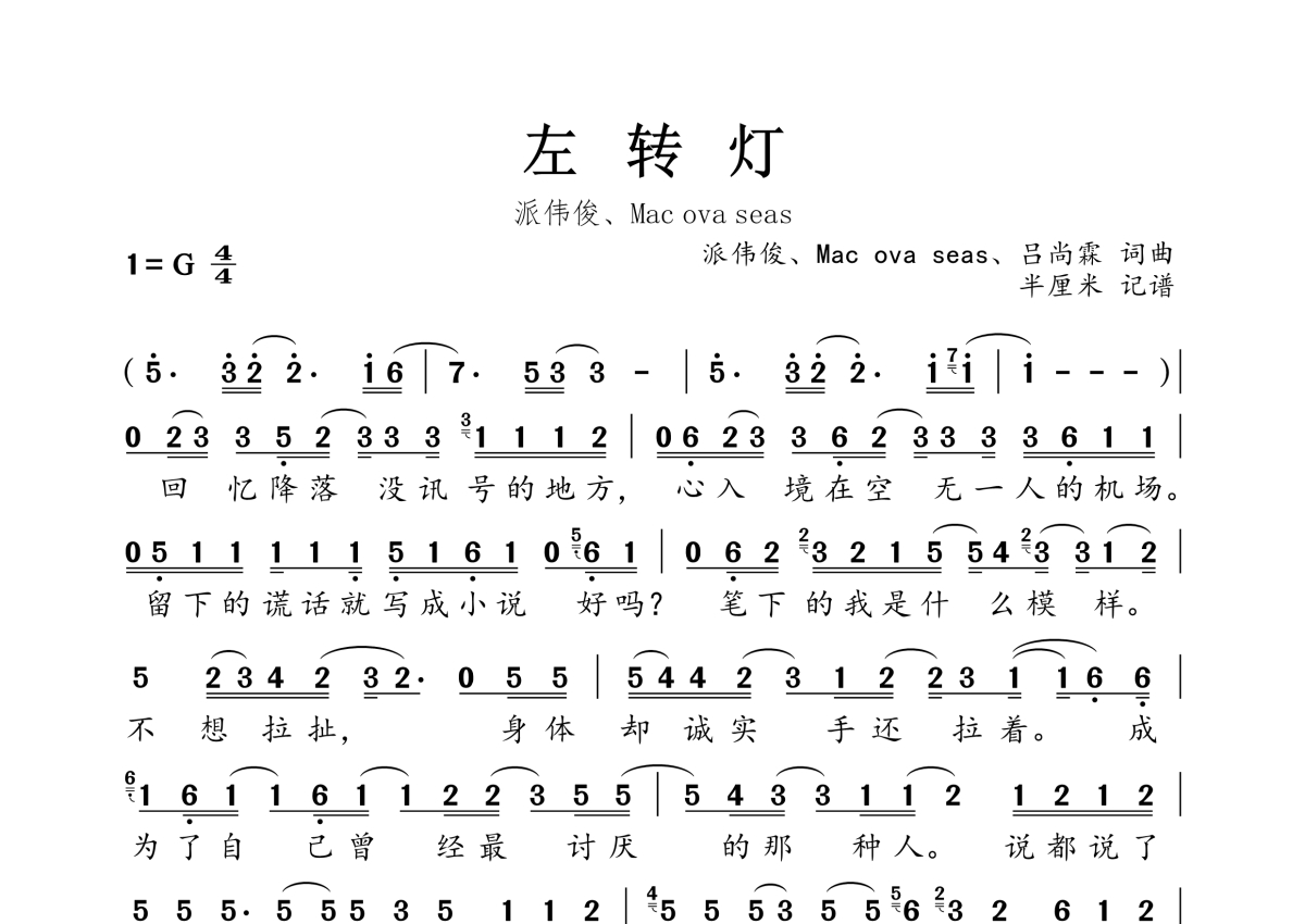 左转灯简谱 - 派伟俊、Mac ova seas演唱