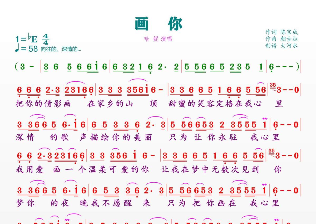 《画你》是哈妮演唱的一首歌曲,拍号为4/4拍,歌曲速度为每分钟58拍,这份简谱共有一张高清图谱,图谱由 @临海雪原 编配上传。