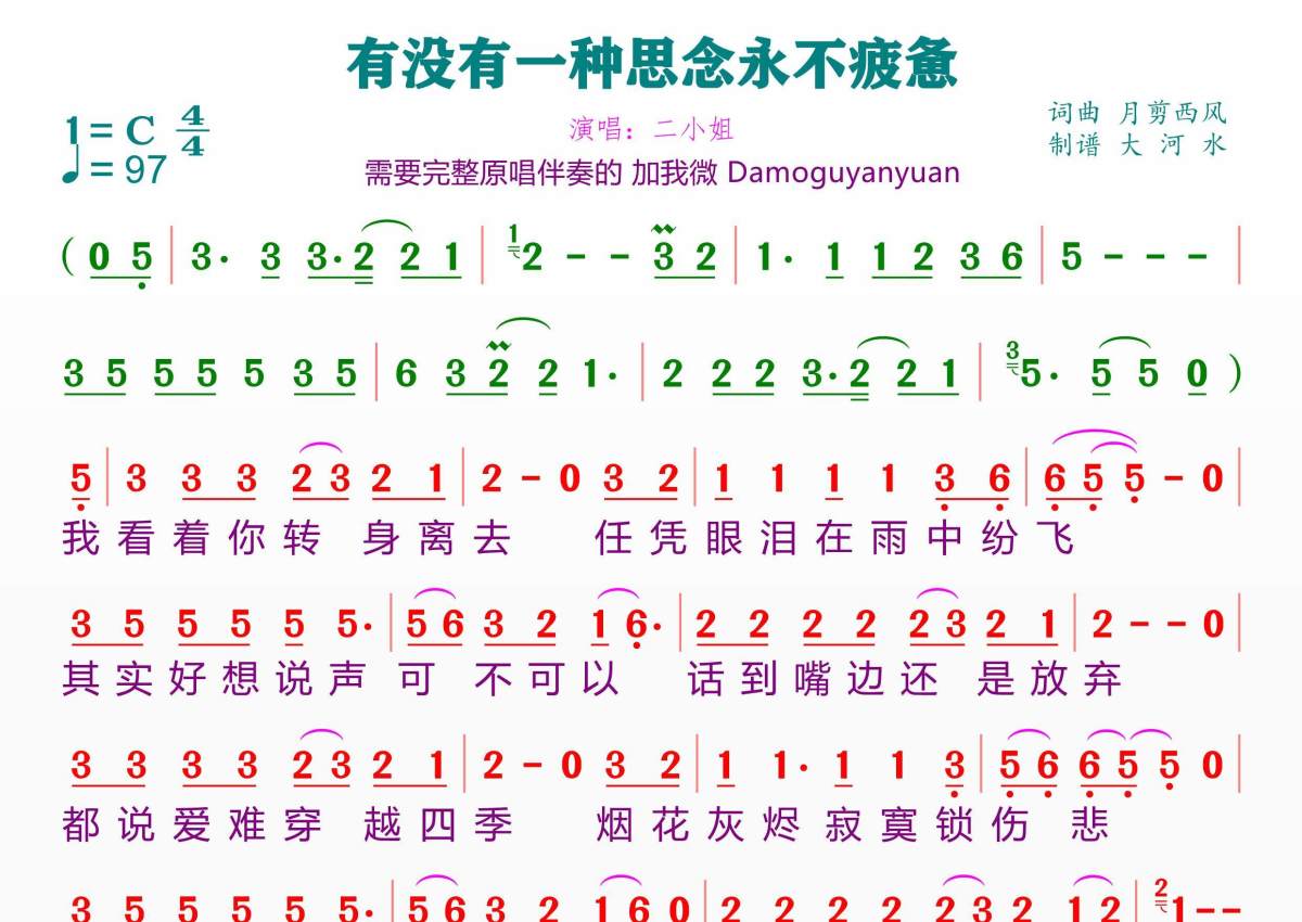 《有没有一种思念永不疲惫》是二小姐演唱的一首歌曲,拍号为4/4拍,歌曲速度为每分钟97拍,这份简谱共有一张高清图谱,图谱由 @临海雪原 编配上传。