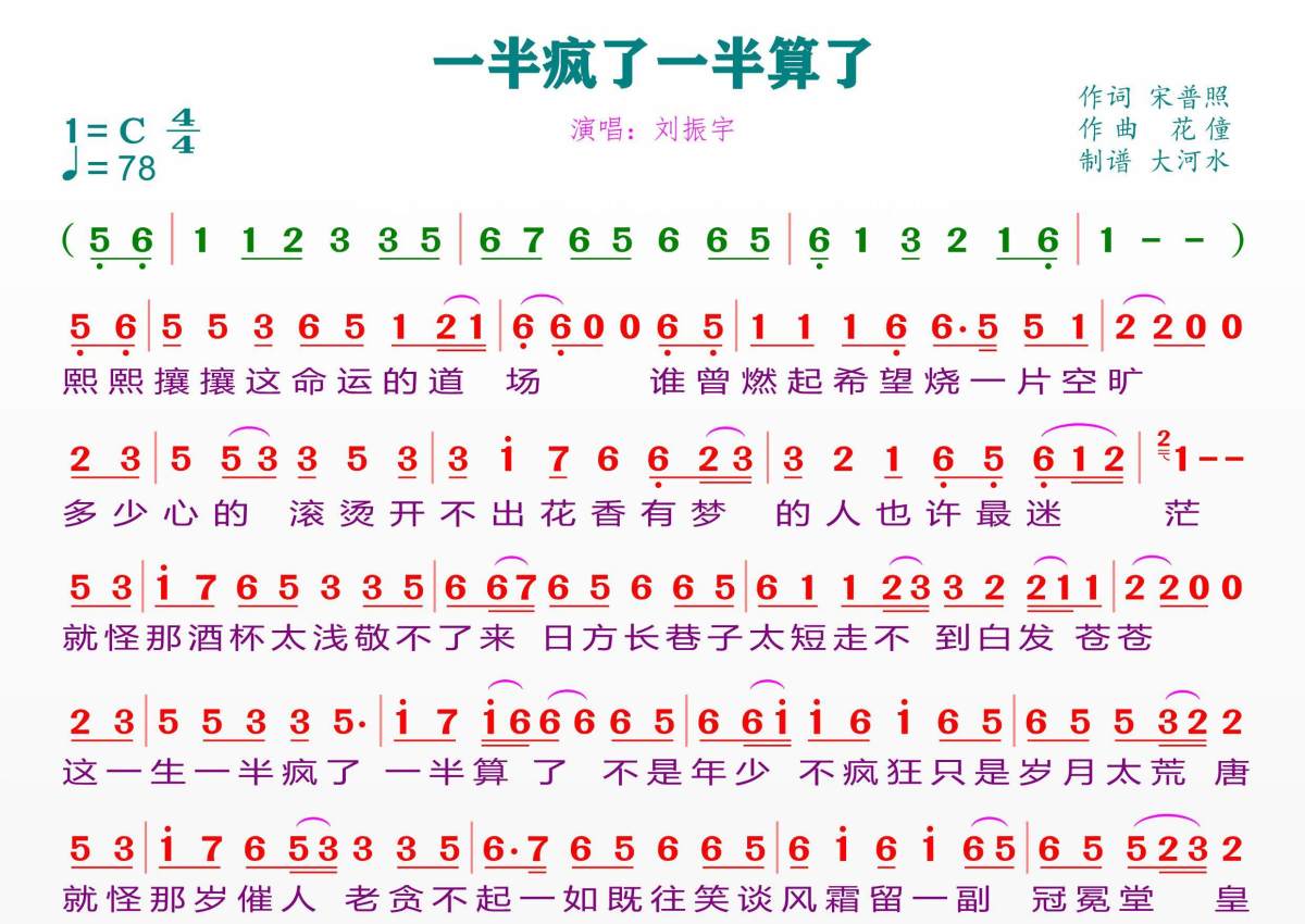 《半疯了一半算了》是刘振宇演唱的一首歌曲,拍号为4/4拍,歌曲速度为每分钟78拍,这份简谱共有一张高清图谱,图谱由 @临海雪原 编配上传。