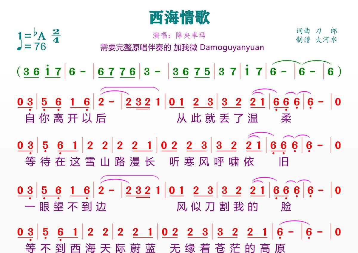 《西海情歌》是降央卓玛演唱的一首歌曲,拍号为2/4拍,歌曲速度为每分钟76拍,这份简谱共有一张高清图谱,图谱由 @临海雪原 编配上传。