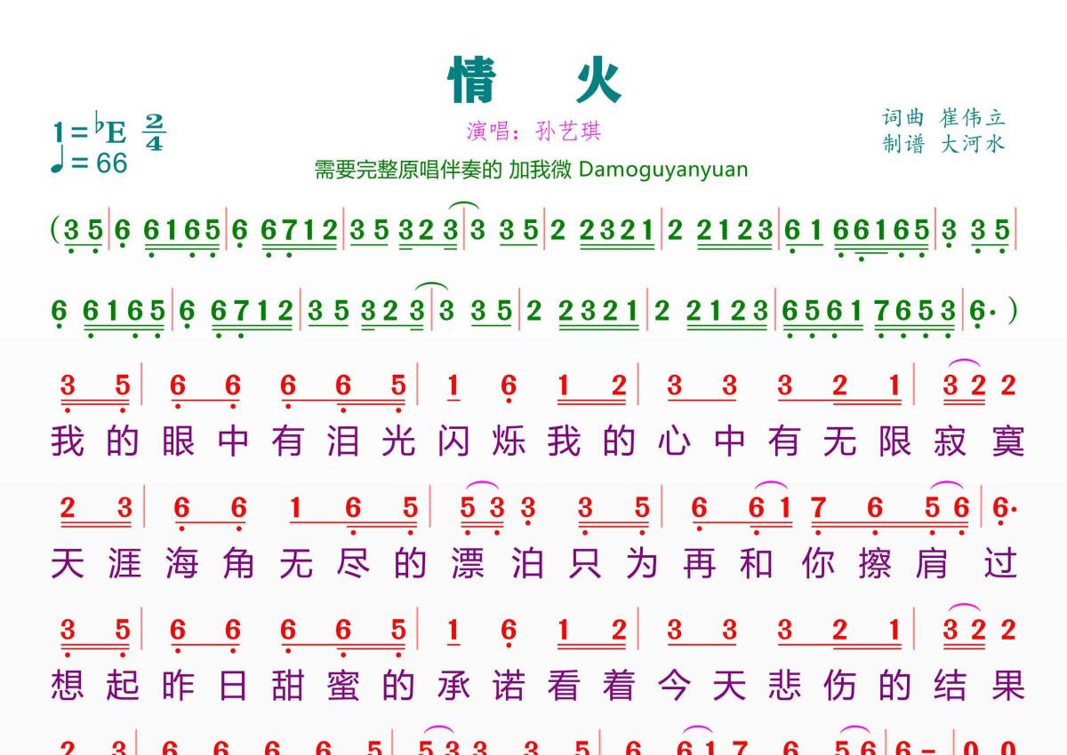 《情火》是孙艺琪演唱的一首歌曲,拍号为2/4拍,歌曲速度为每分钟66拍,这份简谱共有一张高清图谱,图谱由 @临海雪原 编配上传。
