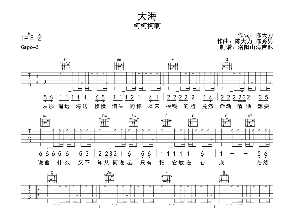 柯柯柯啊《大海》吉他谱 - C调弹唱六线谱