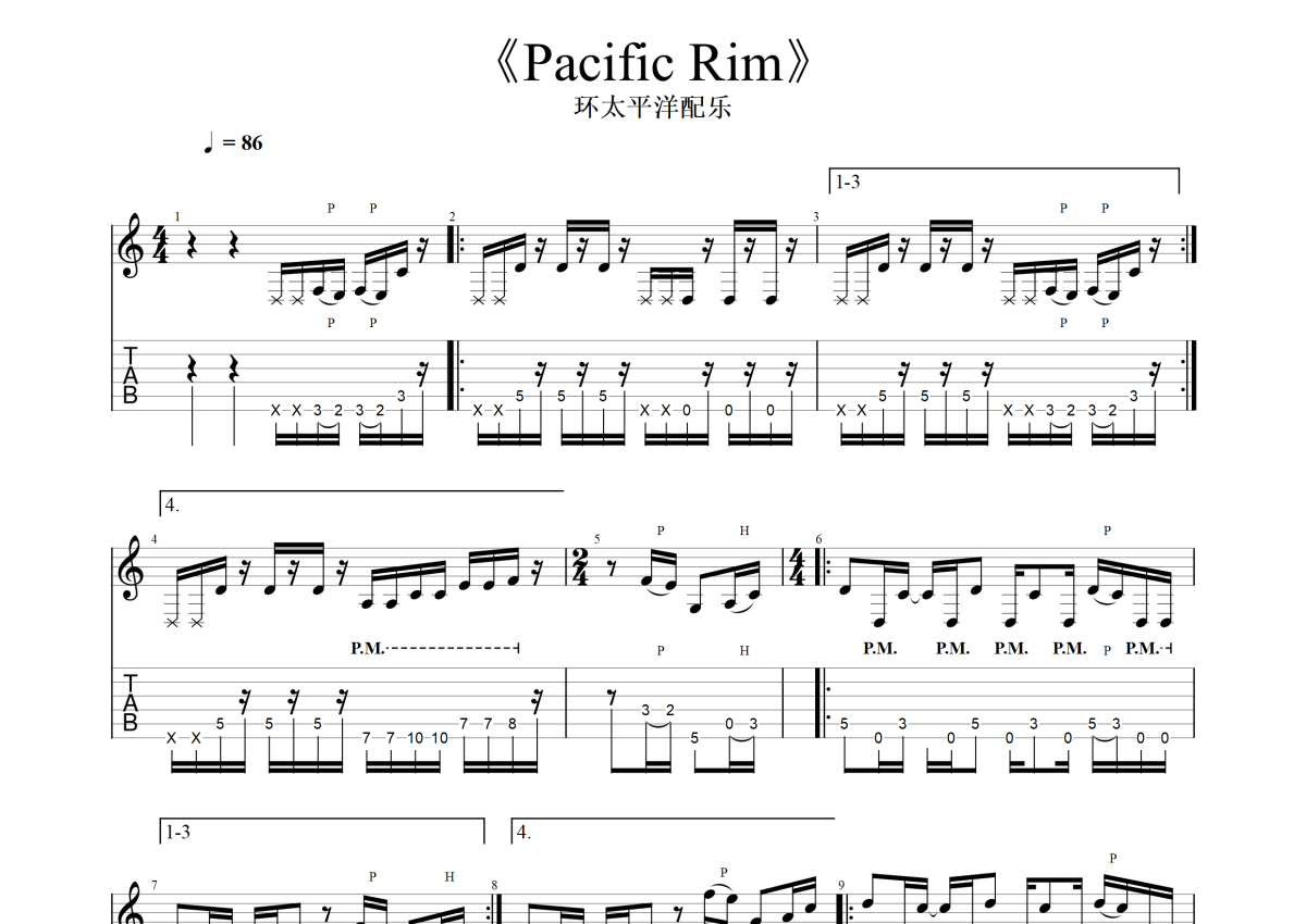 《Pacific Rim》是Tom Morello演唱的一首歌曲,原版,拍号为4/4拍,歌曲速度为每分钟84拍,歌曲原调为F调,这份电吉他谱共有两张高清图谱,图谱由 @mono 编配上传,图谱使用六线谱编配,曲谱配备了相关的音频提供试听,使用这份Pacific Rim电吉他谱,可以让你更加方便地掌握这首歌曲的演奏技巧,快来尝试吧。六弦降全音调弦。
