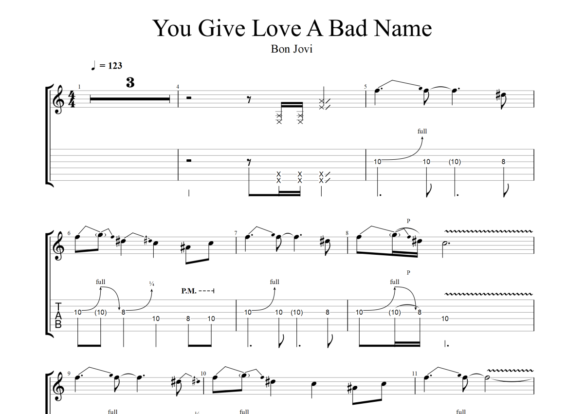 《you give love a bad name》是Bon jovi演唱的一首歌曲,原版,拍号为4/4拍,歌曲速度为每分钟123拍,歌曲原调为Eb调,这份电吉他谱共有六张高清图谱,图谱由 @mono 编配上传,图谱使用六线谱编配,曲谱配备了相关的音频提供试听,使用这份you give love a bad name电吉他谱,可以让你更加方便地掌握这首歌曲的演奏技巧,快来尝试吧。