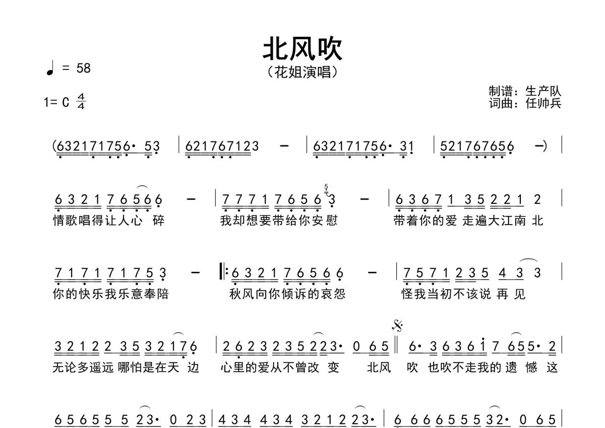 《北风吹》是花姐演唱的一首歌曲,原版简谱,拍号为4/4拍,歌曲速度为每分钟58拍,这份简谱共有一张高清图谱,图谱由 @生产队 编配上传花姐演唱的歌曲《北风吹》原版简谱,完整的前奏、间奏、尾奏solo编配,精编完美版,优质推荐!。