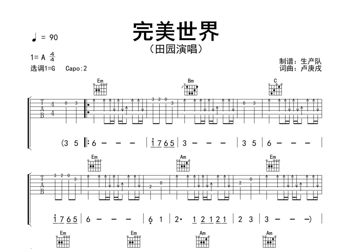 《完美世界(女版)》是女版演唱的一首歌曲,精编完美版,拍号为4/4拍,歌曲速度为每分钟90拍,歌曲原调为A调,但由于原调指法比较难,为了方便弹奏,本吉他谱采用的是G调指法编配,变调夹2品弹奏即为原调,当然也可以根据自己的音域改变变调夹位置,或者通过改变和弦调性,以方便自己弹奏,这份吉他谱共有两张高清图谱,图谱由 @生产队 编配上传,图谱使用六线谱编配,包含吉他和弦指法、简谱以及歌词部分,使用这份完美世界(女版)吉他谱,可以让你更加方便地掌握这首歌曲的弹唱技巧,快来尝试吧。田园演唱的歌曲《完美世界》(女版)原版吉他谱,完整的前奏、间奏solo编配,精编完美版,优质推荐!。