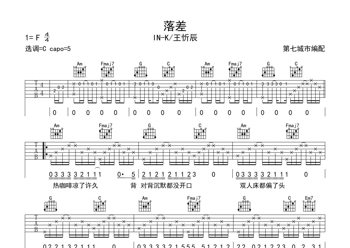 《落差》是IN-K/王忻辰演唱的一首歌曲,本吉他谱采用的是C调指法编配,这份吉他谱共有两张高清图谱,图谱由 @第七城市 编配上传,图谱使用六线谱编配,包含吉他和弦指法、简谱以及歌词部分,曲谱配备了相关的视频提供浏览,使用这份落差吉他谱,可以让你更加方便地掌握这首歌曲的弹唱技巧,快来尝试吧。《落差》吉他谱,IN-K王忻辰的一首网络热门歌曲,落差吉他弹唱谱,歌曲原调F,选用C调指法,变调夹夹第五品。很多时候,不是喜欢上一个人卑微,而是喜欢上一个不喜欢你的人才卑微。在爱情里你的姿态越低,对方越会对你不屑一顾。这样的爱情又会有什么意义呢?握不住的沙,不如扬了它。
