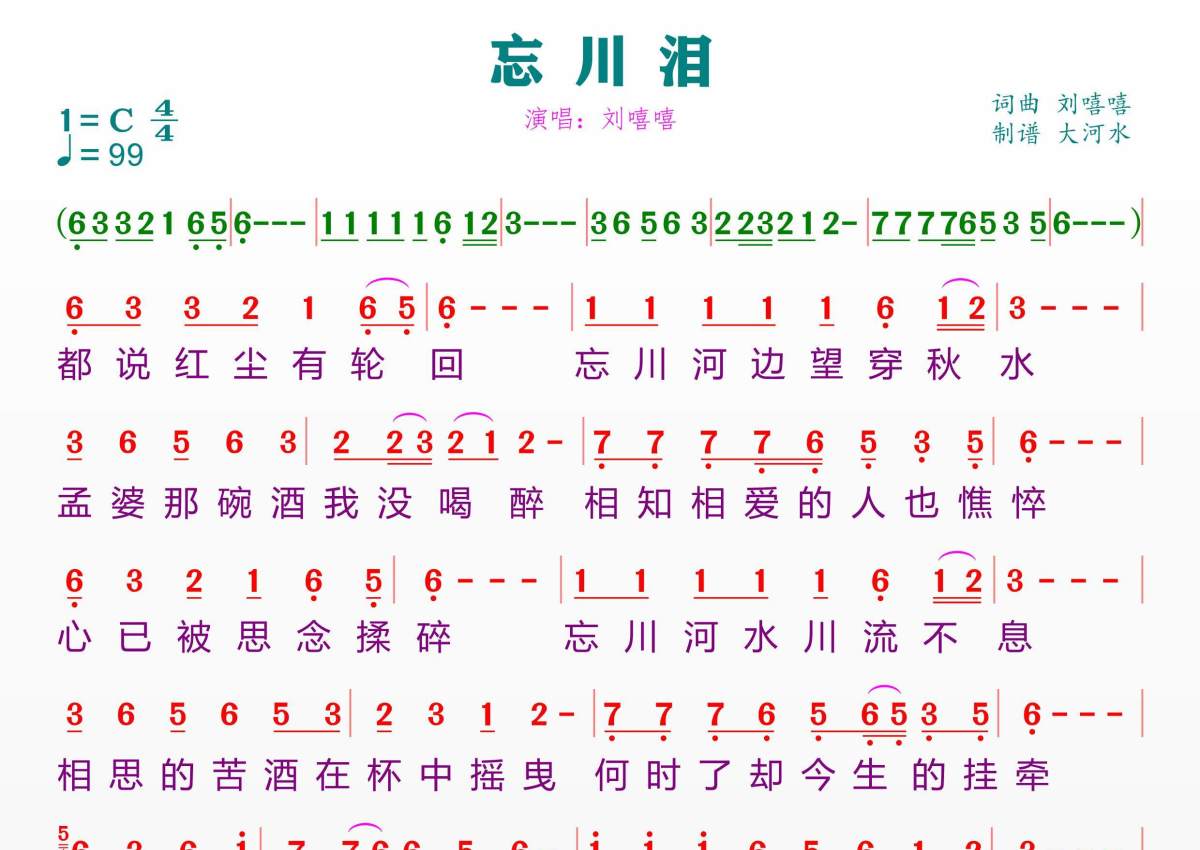 《忘川泪》是刘嘻嘻演唱的一首歌曲,拍号为4/4拍,歌曲速度为每分钟99拍,这份简谱共有一张高清图谱,图谱由 @临海雪原 编配上传。