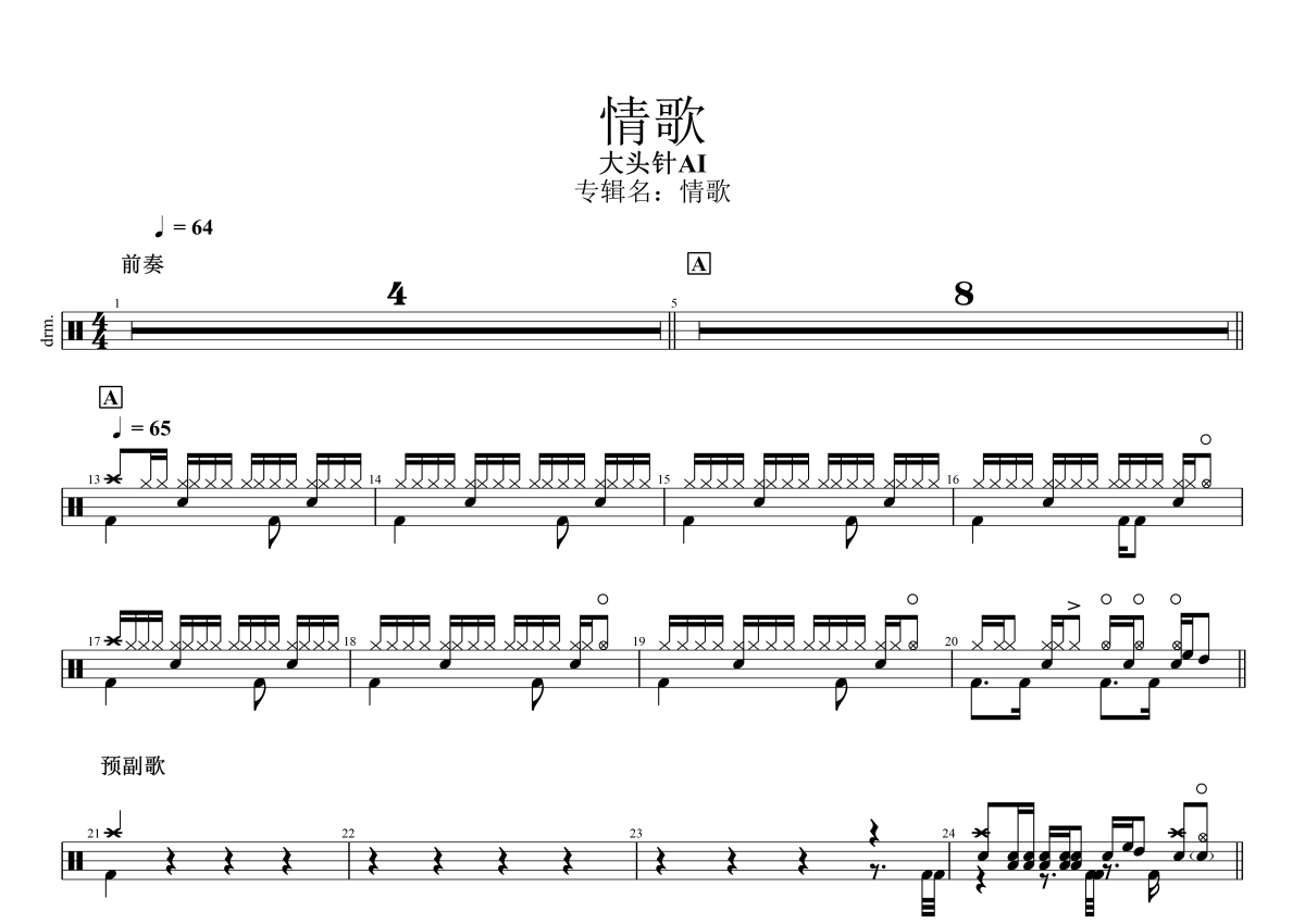 大头针Al《情歌》架子鼓谱