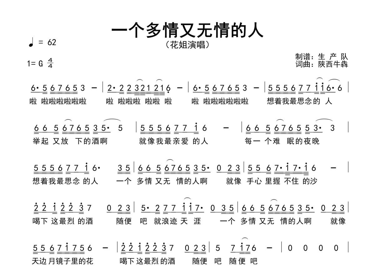 《一个多情又无情的人》是花姐演唱的一首歌曲,原版简谱,拍号为4/4拍,歌曲速度为每分钟62拍,这份简谱共有一张高清图谱,图谱由 @生产队 编配上传花姐演唱的歌曲《一个多情又无情的人》原版简谱,精编完美版,优质推荐。