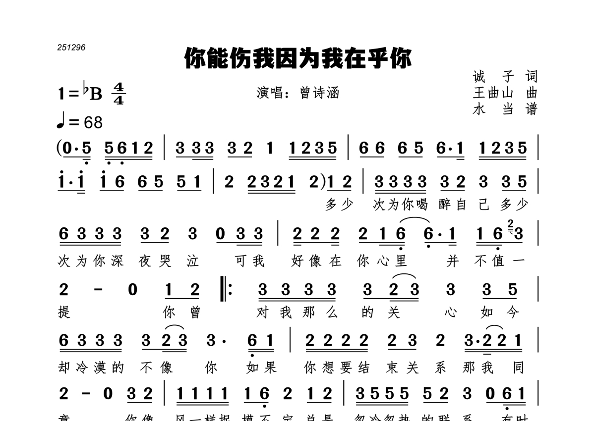 你能伤我因为我在乎你简谱 - 曾诗涵演唱