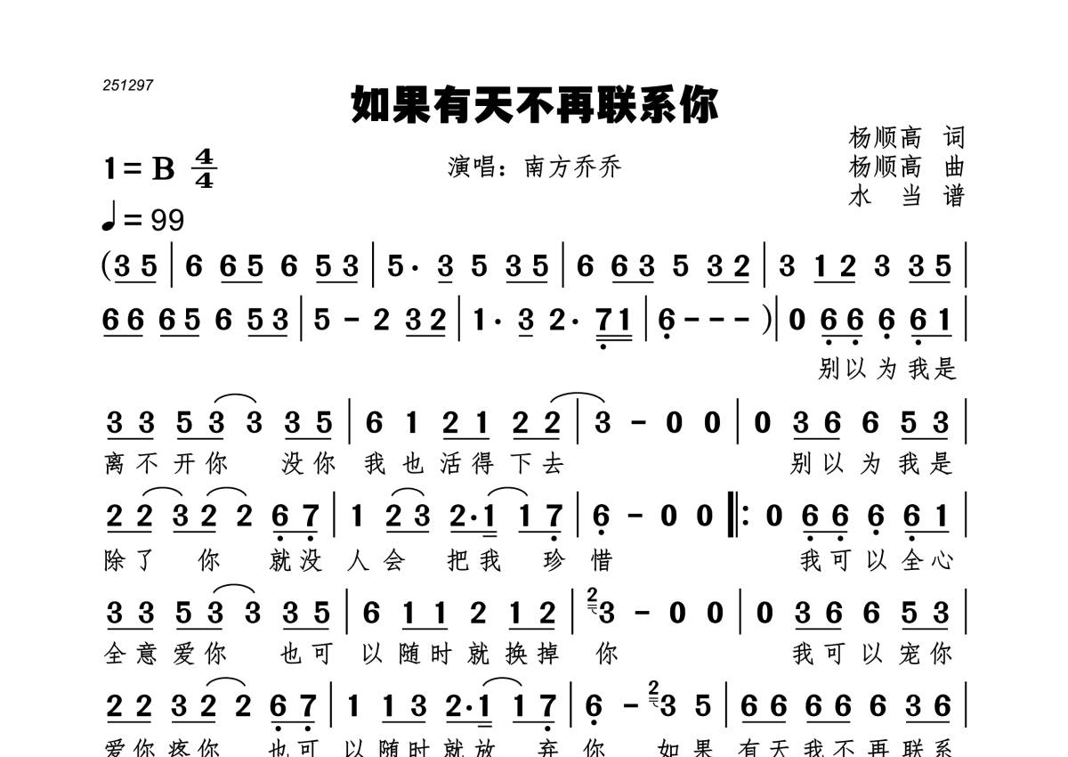 《如果有天不再联系你》是南方乔乔演唱的一首歌曲,拍号为4/4拍,歌曲速度为每分钟99拍,这份简谱共有一张高清图谱,图谱由 @水当 编配上传。