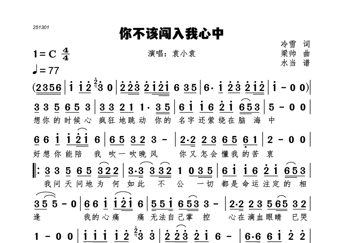 你不该闯入我心中简谱 - 袁小袁演唱