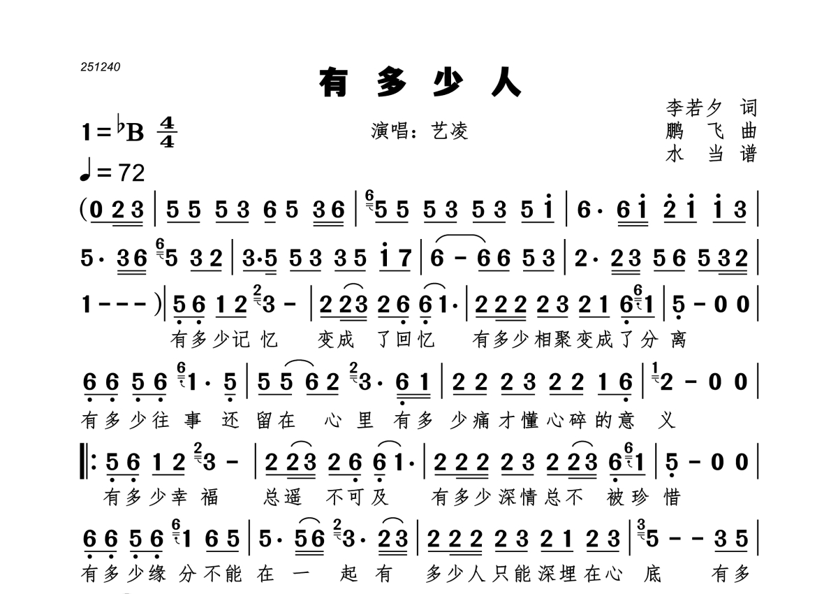 《有多少人》是艺凌演唱的一首歌曲,拍号为4/4拍,歌曲速度为每分钟72拍,这份简谱共有一张高清图谱,图谱由 @水当 编配上传。