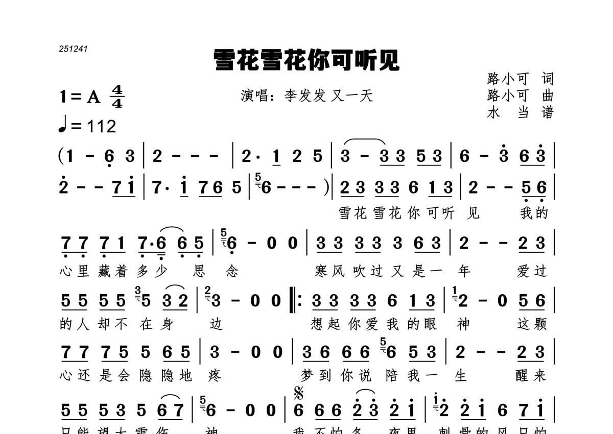 雪花雪花你可听见简谱 - 李发发 又一天演唱