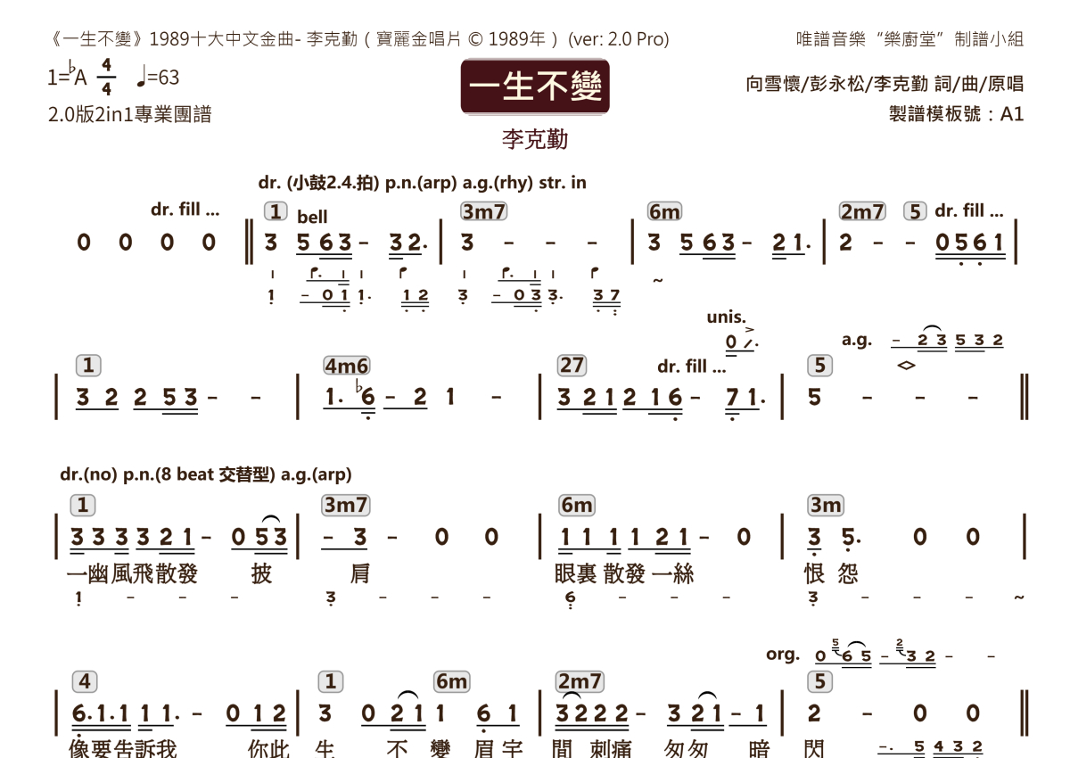 李克勤《一生不变》乐队总谱 - 2.0版多功能团谱