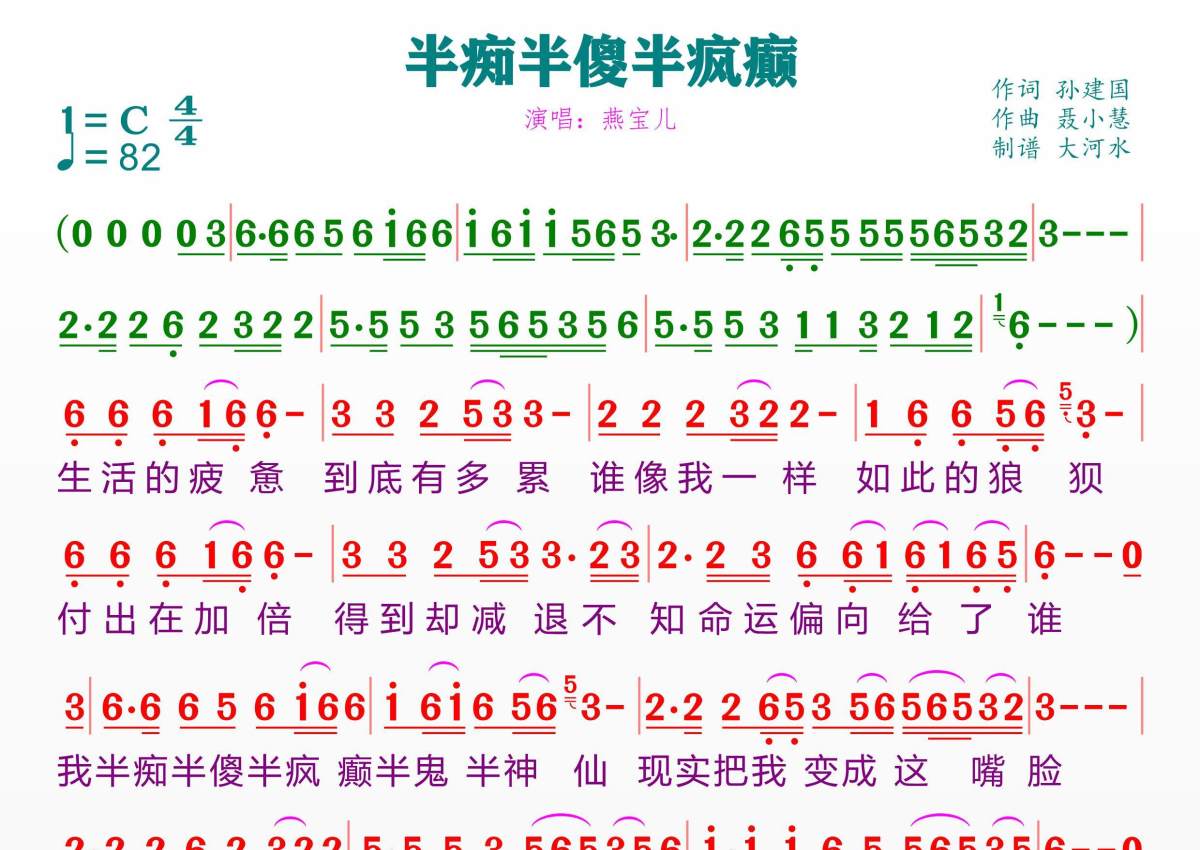 《半痴半傻半疯癫》是燕宝儿演唱的一首歌曲,拍号为4/4拍,歌曲速度为每分钟82拍,这份简谱共有一张高清图谱,图谱由 @临海雪原 编配上传。