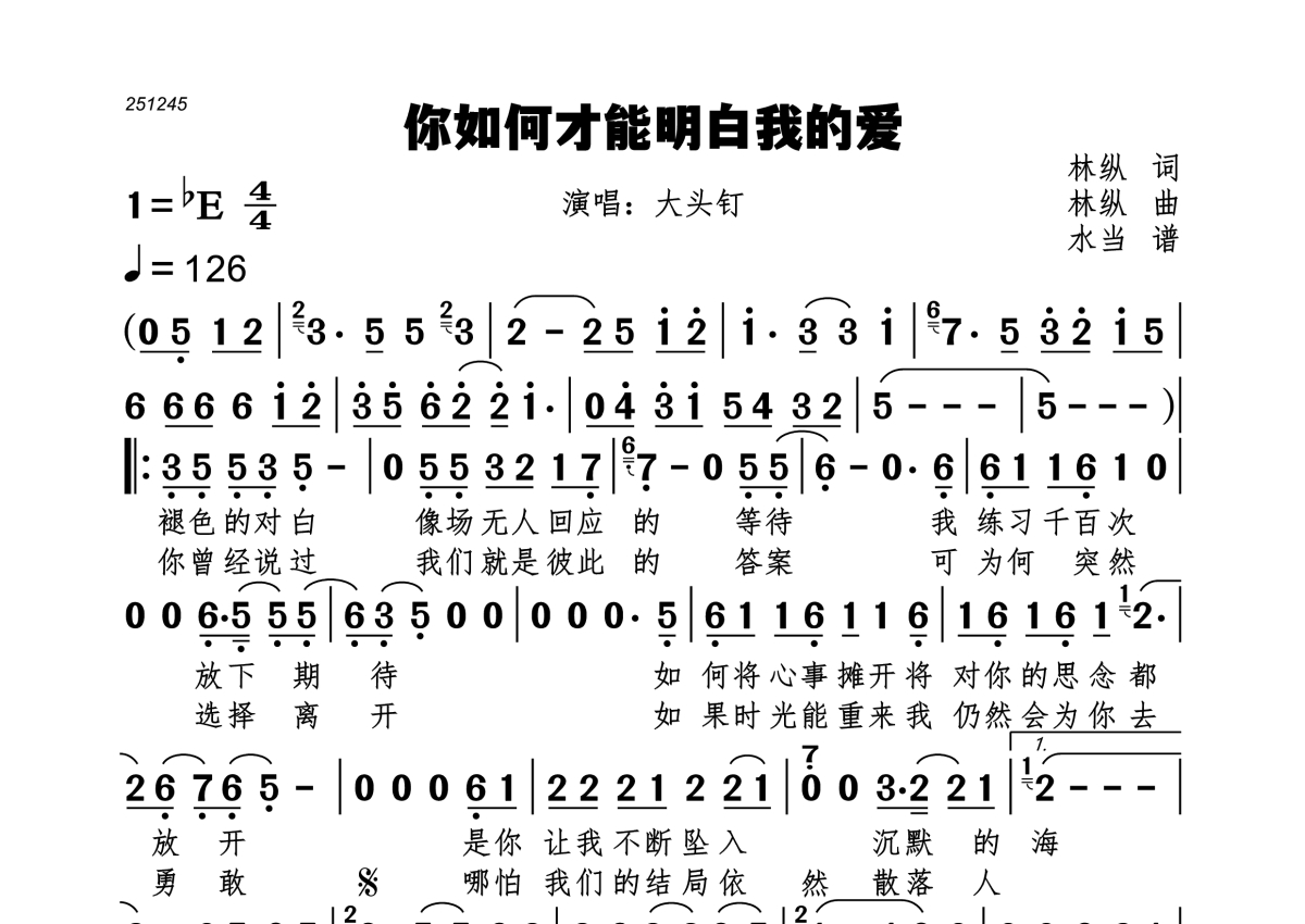 《你如何才能明白我的爱》是大头钉演唱的一首歌曲,拍号为4/4拍,歌曲速度为每分钟126拍,这份简谱共有一张高清图谱,图谱由 @水当 编配上传。