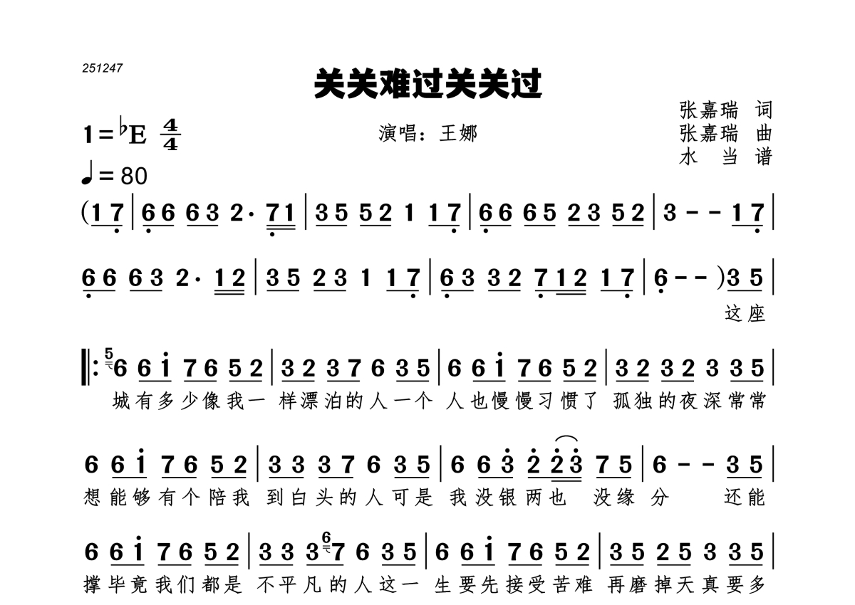 《关关难过关关过》是王娜演唱的一首歌曲,拍号为4/4拍,歌曲速度为每分钟80拍,这份简谱共有一张高清图谱,图谱由 @水当 编配上传。