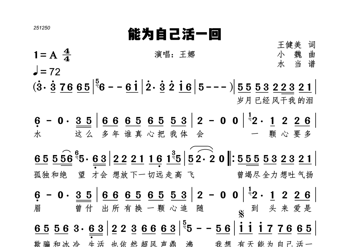 《能为自己活一回》是王娜演唱的一首歌曲,拍号为4/4拍,歌曲速度为每分钟72拍,这份简谱共有一张高清图谱,图谱由 @水当 编配上传。