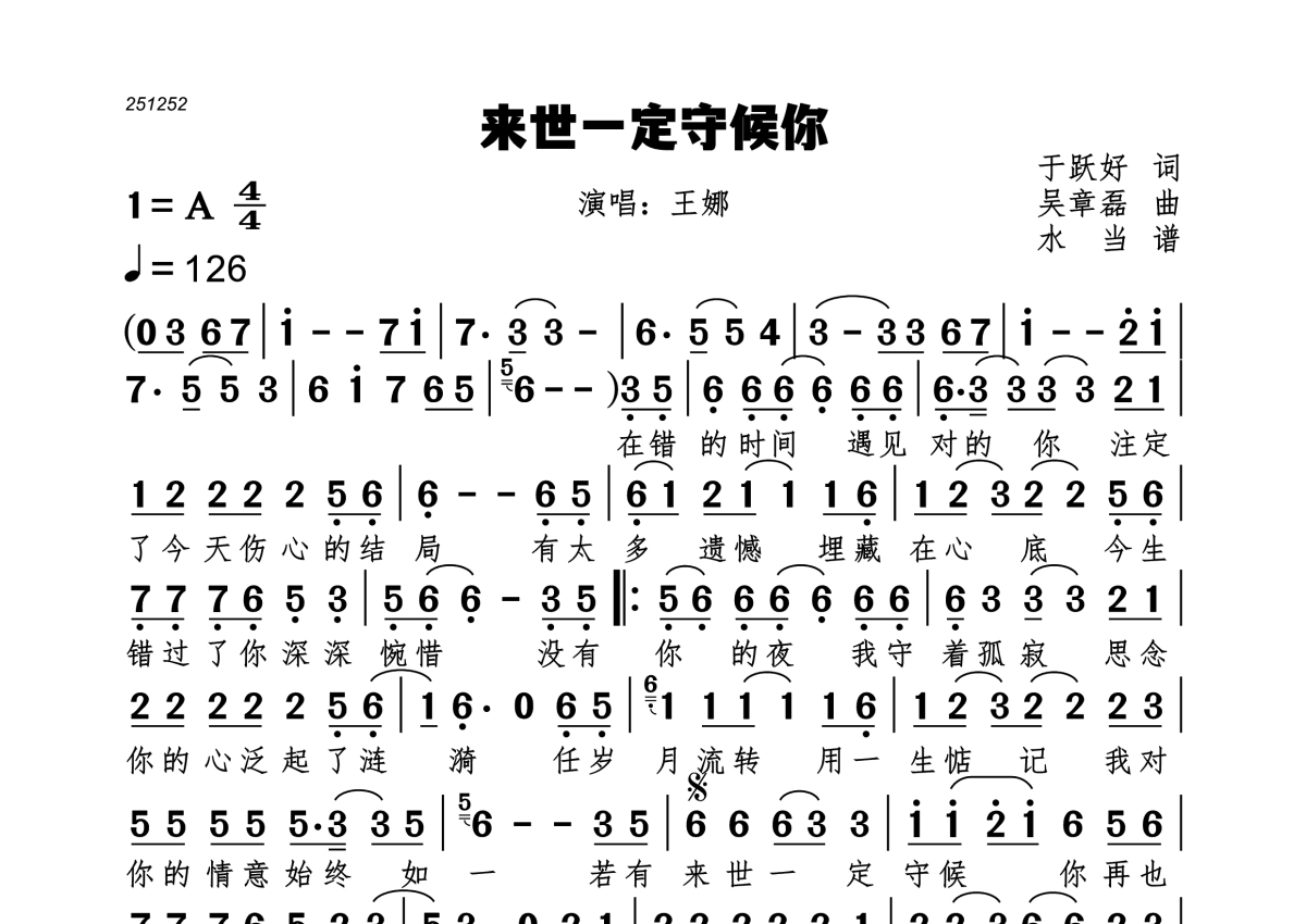 《来世一定守候你》是王娜演唱的一首歌曲,拍号为4/4拍,歌曲速度为每分钟126拍,这份简谱共有一张高清图谱,图谱由 @水当 编配上传。