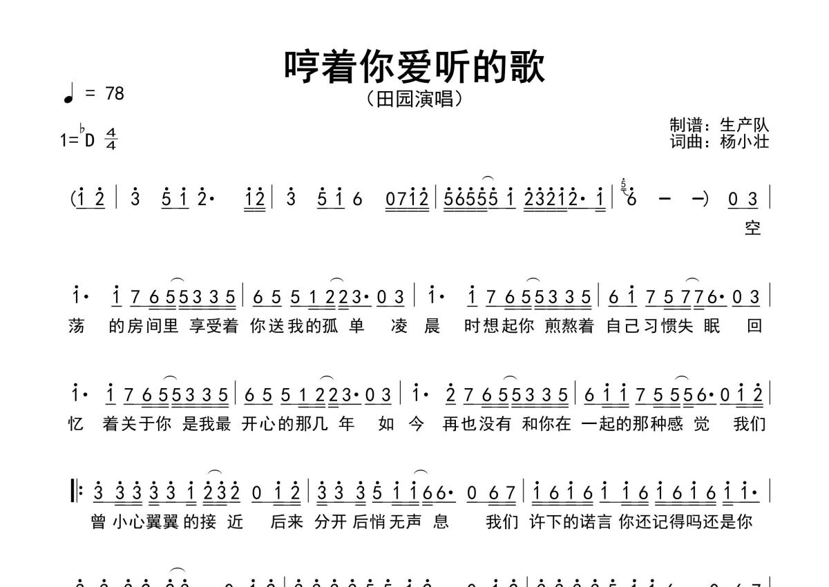《哼着你爱听的歌》是田园演唱的一首歌曲,原版简谱,拍号为4/4拍,歌曲速度为每分钟78拍,这份简谱共有一张高清图谱,图谱由 @生产队 编配上传田园演唱的歌曲《哼着你爱听的歌(女版)》原版简谱,完整的前奏、间奏、尾奏solo编配,精编完美版,优质推荐!。