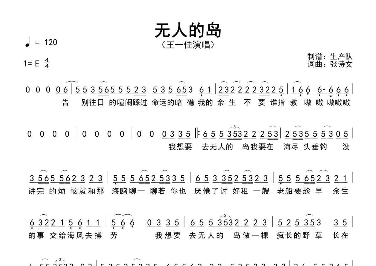 《无人的岛(节奏版)》是节奏版演唱的一首歌曲,原版简谱,拍号为4/4拍,歌曲速度为每分钟120拍,这份简谱共有一张高清图谱,图谱由 @生产队 编配上传王一佳演唱的歌曲《无人的岛(节奏版)》原版简谱,完整的间奏、尾奏solo编配,精编完美版,优质推荐!。