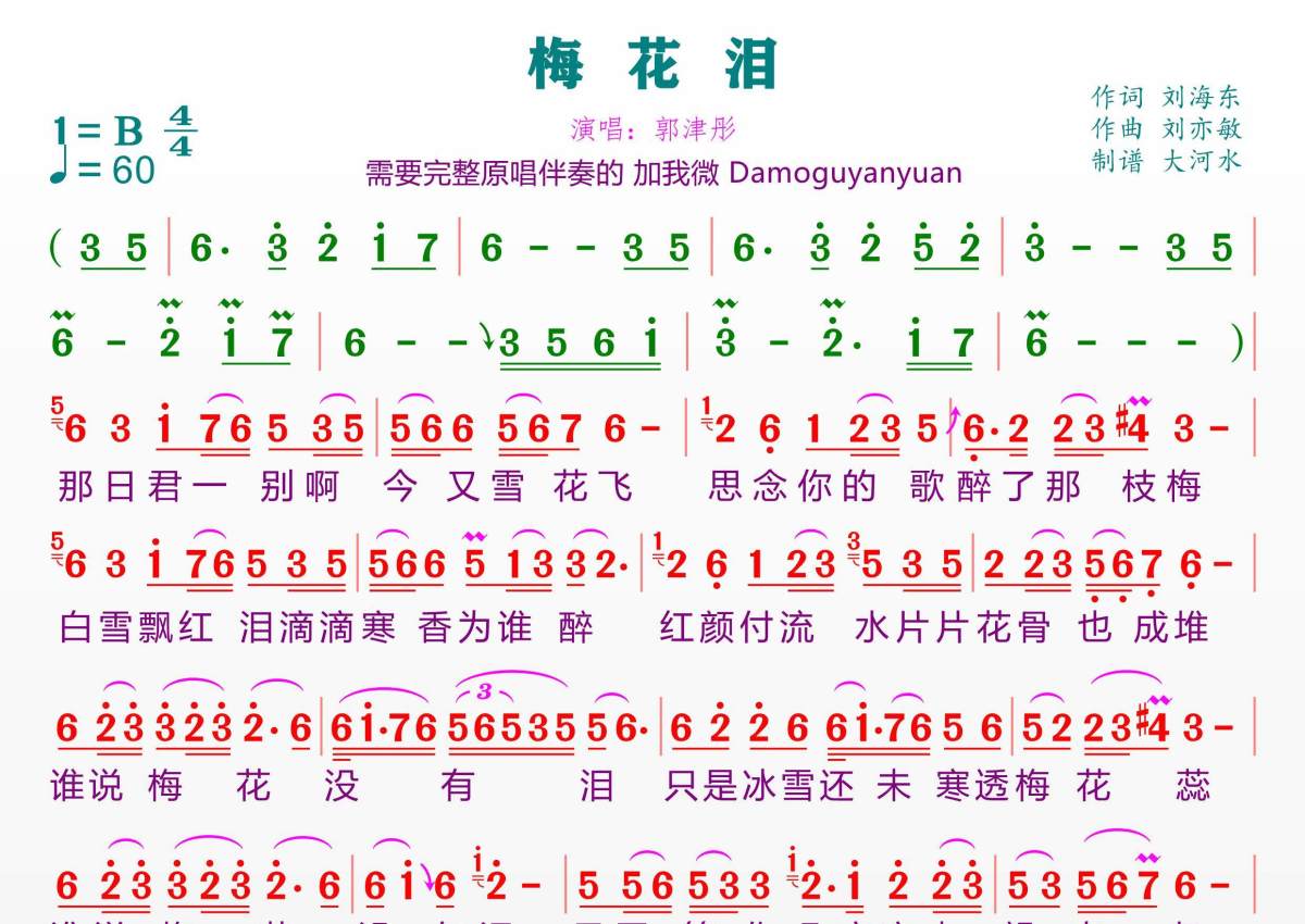 《梅花泪》是云菲菲演唱的一首歌曲,拍号为4/4拍,歌曲速度为每分钟60拍,这份简谱共有一张高清图谱,图谱由 @临海雪原 编配上传。