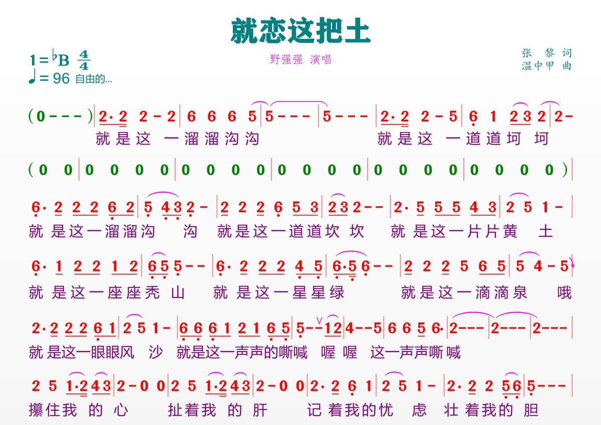 《就恋这把土》是野强强演唱的一首歌曲,拍号为4/4拍,歌曲速度为每分钟96拍,这份简谱共有一张高清图谱,图谱由 @临海雪原 编配上传。