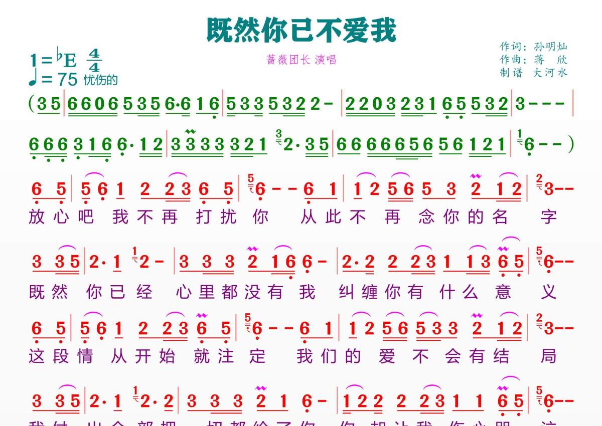 《既然你已不爱我》是蔷薇团长演唱的一首歌曲,拍号为4/4拍,歌曲速度为每分钟75拍,这份简谱共有一张高清图谱,图谱由 @临海雪原 编配上传。