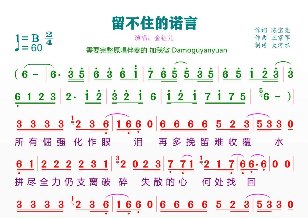 《留不住的诺言》是金钰儿演唱的一首歌曲,拍号为2/4拍,歌曲速度为每分钟60拍,这份简谱共有一张高清图谱,图谱由 @临海雪原 编配上传。